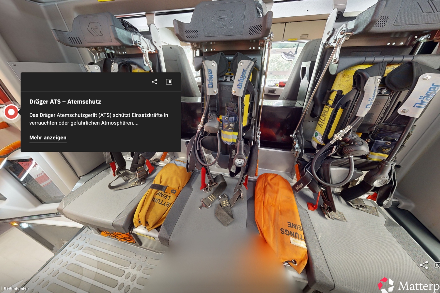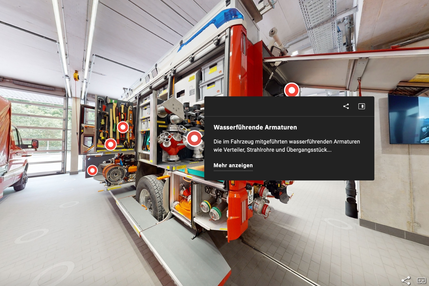 Für die Feuerwehr Tux erstellten wir einen interaktiven 3D-Rundgang, der die Einsatzfahrzeuge sowie verschiedene Einsatzgeräte zeigt. Über interaktive Tags können Nutzer auf die Geräte klicken und erhalten detaillierte Informationen zu jedem Einsatzgerät. Die Herausforderung lag in der präzisen Darstellung und der Integration der interaktiven Elemente.